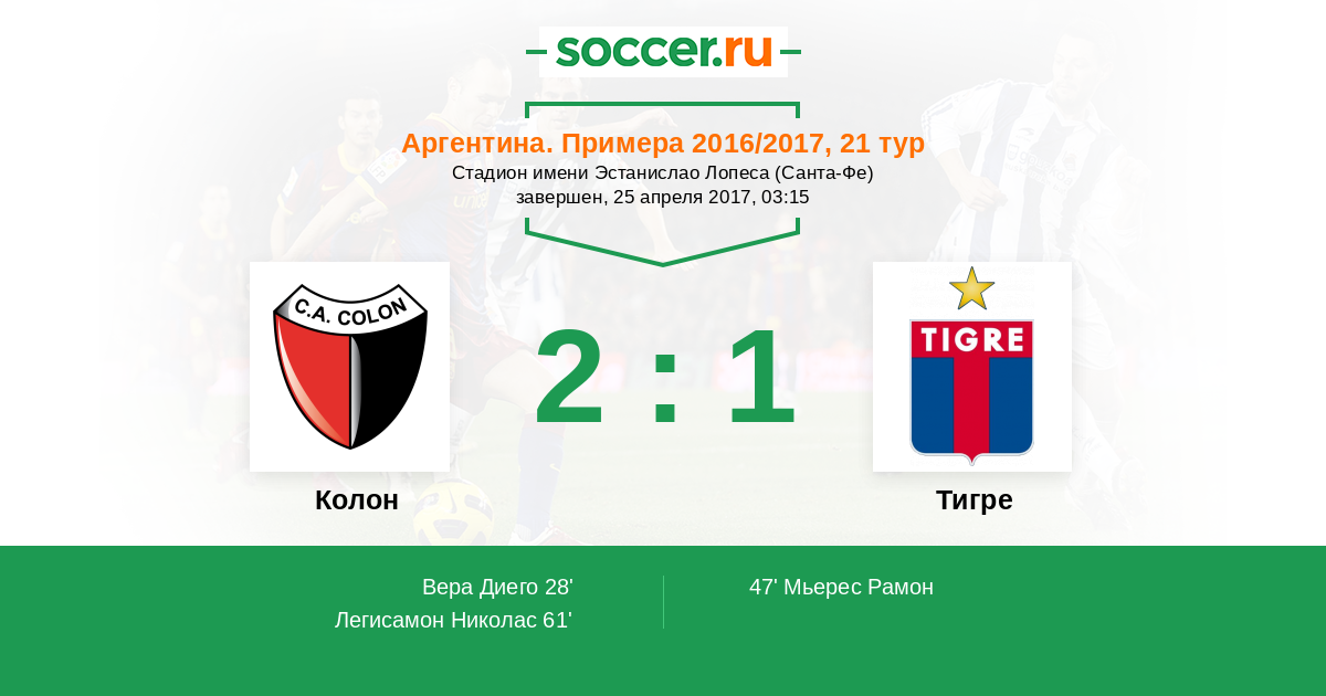 Аргентина. Суперлига 21.03.2015 Колон Логотип футбольный клуб Колон (Санте-Фе) 0:1 Логотип футбольный клуб Тигре (Буэнос-Айрес) Тигре
