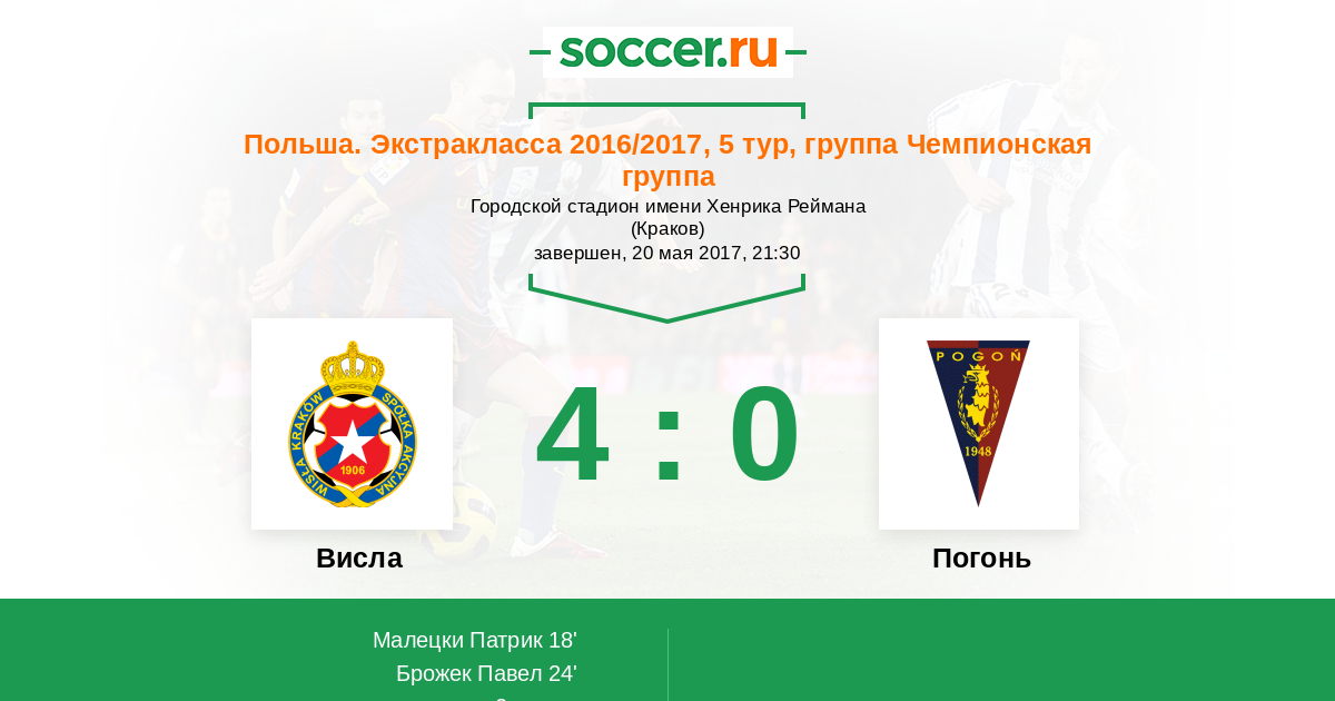 Польша. Экстракласса 16.07.2016 Висла Логотип футбольный клуб Висла (Краков) 2:1 Логотип футбольный клуб Погонь (Щецин) Погонь
