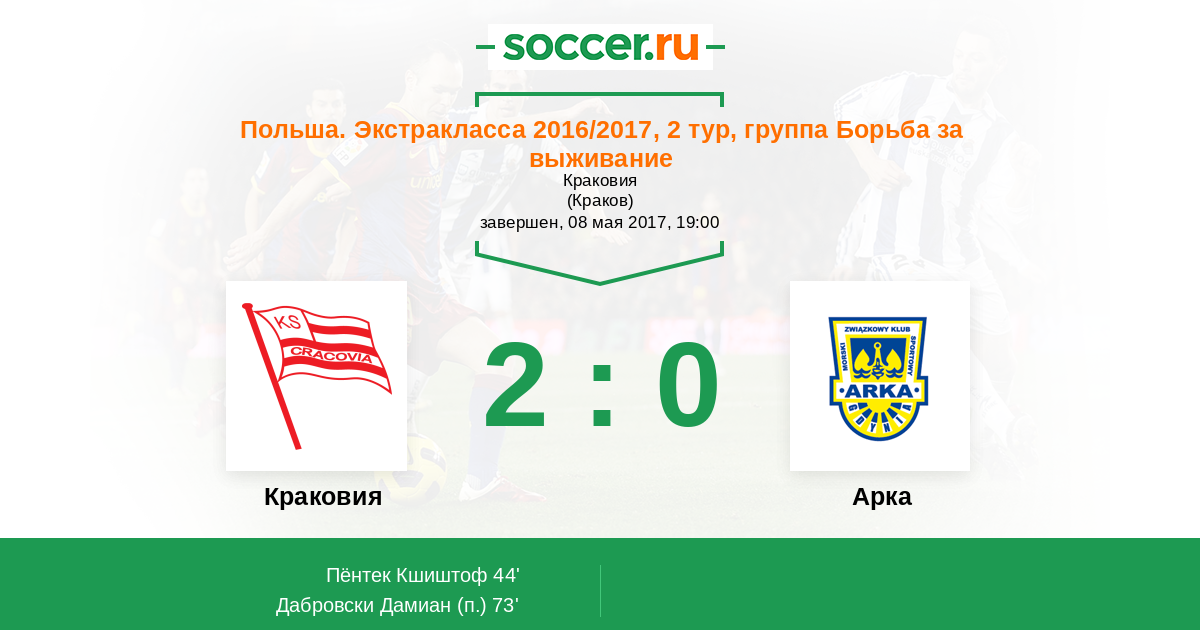 Польша. Экстракласса 08.05.2018 Арка Логотип футбольный клуб Арка (Гдыня) 2:0 Логотип футбольный клуб Краковия Краковия