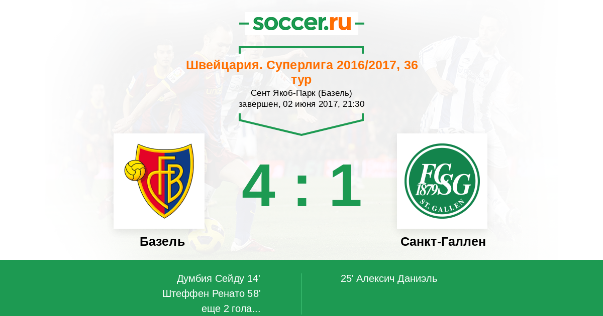 Швейцария. Суперлига 01.04.2017 Санкт-Галлен Логотип футбольный клуб Санкт-Галлен 0:3 Логотип футбольный клуб Базель Базель