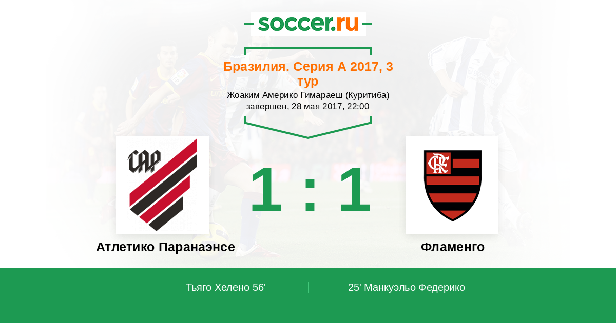 Бразилия. Серия А 27.08.2017 Фламенго Логотип футбольный клуб Фламенго (Рио-де-Жанейро) 2:0 Логотип футбольный клуб Атлетико Паранаэнсе (Куритиба) Атлетико Паранаэнсе