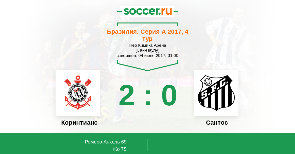 Бразилия. Серия А 10.09.2017 Сантос Логотип футбольный клуб Сантос (Сан-Паулу) 2:0 Логотип футбольный клуб Коринтианс (Сан-Паулу) Коринтианс