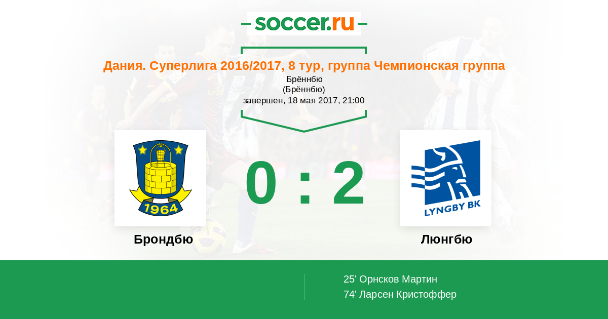Дания. Суперлига 22.09.2016 Люнгбю Логотип футбольный клуб Люнгбю (Конгес Люнгбю) 1:0 Логотип футбольный клуб Брондбю (Брённбю) Брондбю