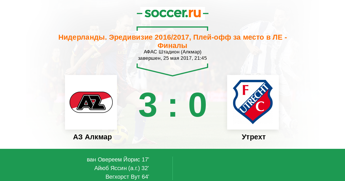 Нидерланды. Эредивизи 28.05.2017 Утрехт Логотип футбольный клуб Утрехт 3:0 (4:3) Логотип футбольный клуб АЗ Алкмар АЗ Алкмар