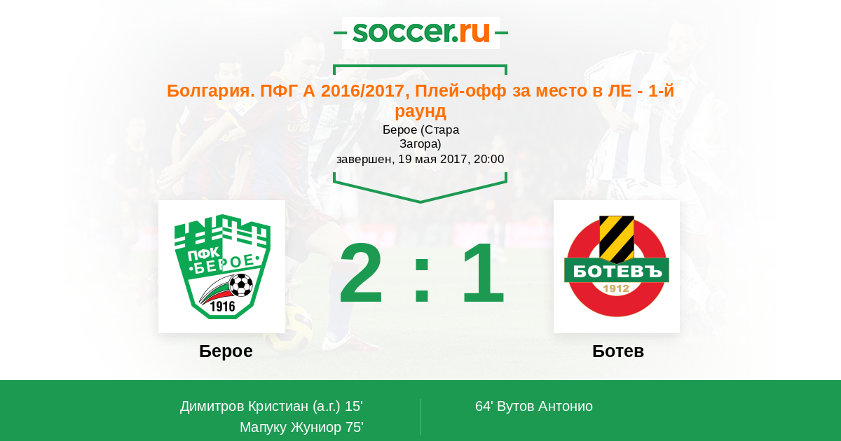 Болгария. Первая лига 15.05.2017 Ботев Логотип футбольный клуб Ботев (Пловдив) 3:0 Логотип футбольный клуб Берое (Стара-Загора) Берое