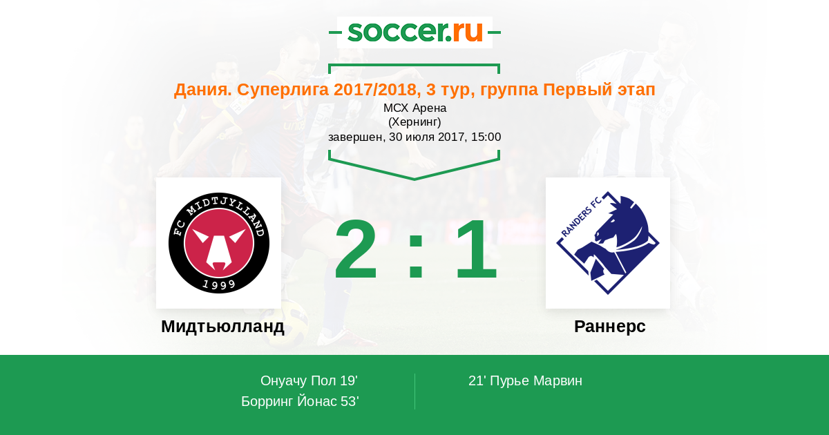 Дания. Суперлига 18.07.2016 Мидтьюлланд Логотип футбольный клуб Мидтьюлланд (Хернинг) 2:2 Логотип футбольный клуб Раннерс Раннерс