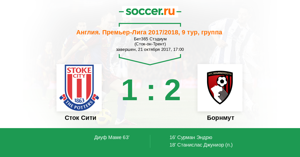 Англия. Премьер-Лига 03.02.2018 Борнмут Логотип футбольный клуб Борнмут 2:1 Логотип футбольный клуб Сток Сити (Сток-он-Трент) Сток Сити