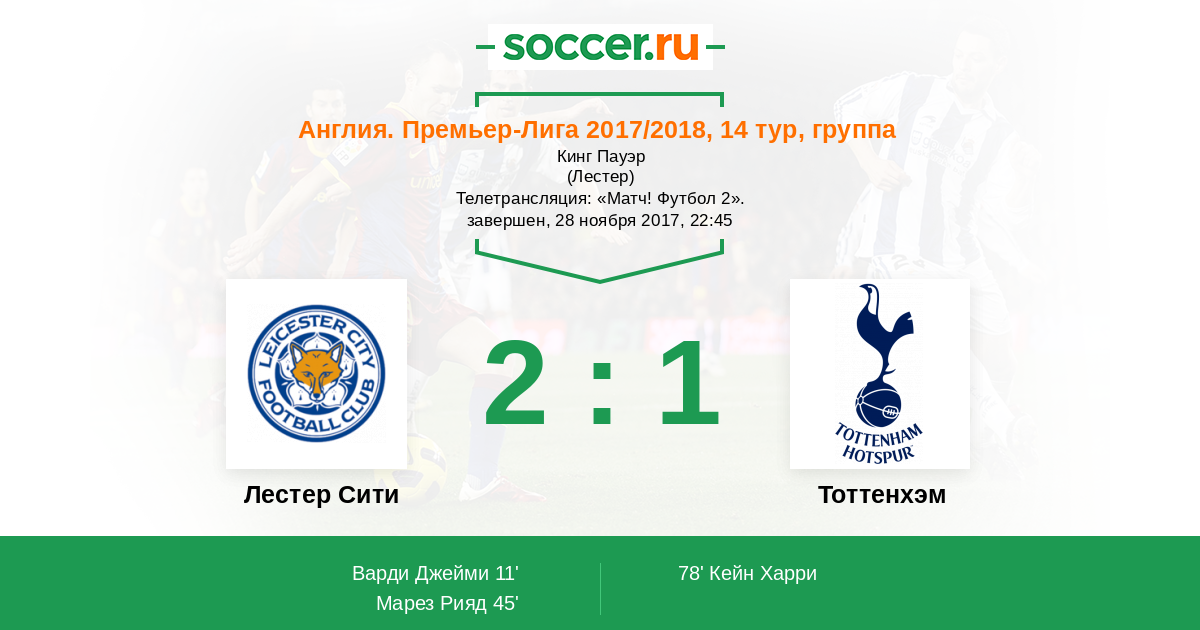 Англия. Премьер-Лига 08.12.2018 Лестер Сити Логотип футбольный клуб Лестер Сити 0:2 Логотип футбольный клуб Тоттенхэм (Лондон) Тоттенхэм