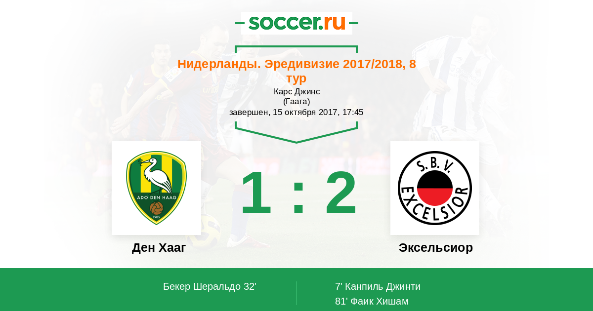 Нидерланды. Эредивизи 16.03.2018 Эксельсиор Логотип футбольный клуб Эксельсиор (Роттердам) 1:2 Логотип футбольный клуб Ден Хааг (Гаага) Ден Хааг
