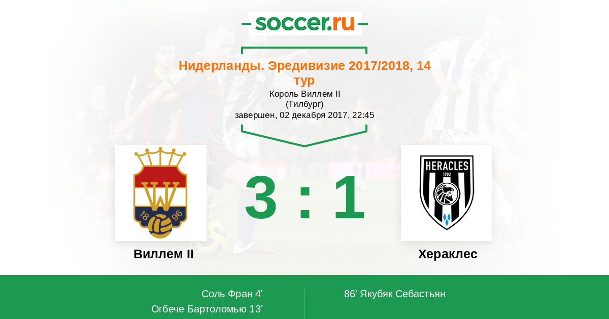 Нидерланды. Эредивизи 04.02.2017 Виллем II Логотип футбольный клуб Виллем II (Тилбург) 1:3 Логотип футбольный клуб Хераклес (Алмело) Хераклес