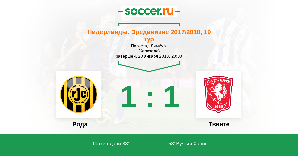 Нидерланды. Эредивизи 21.10.2017 Твенте Логотип футбольный клуб Твенте (Энсхеде) 3:0 Логотип футбольный клуб Рода (Керкраде) Рода