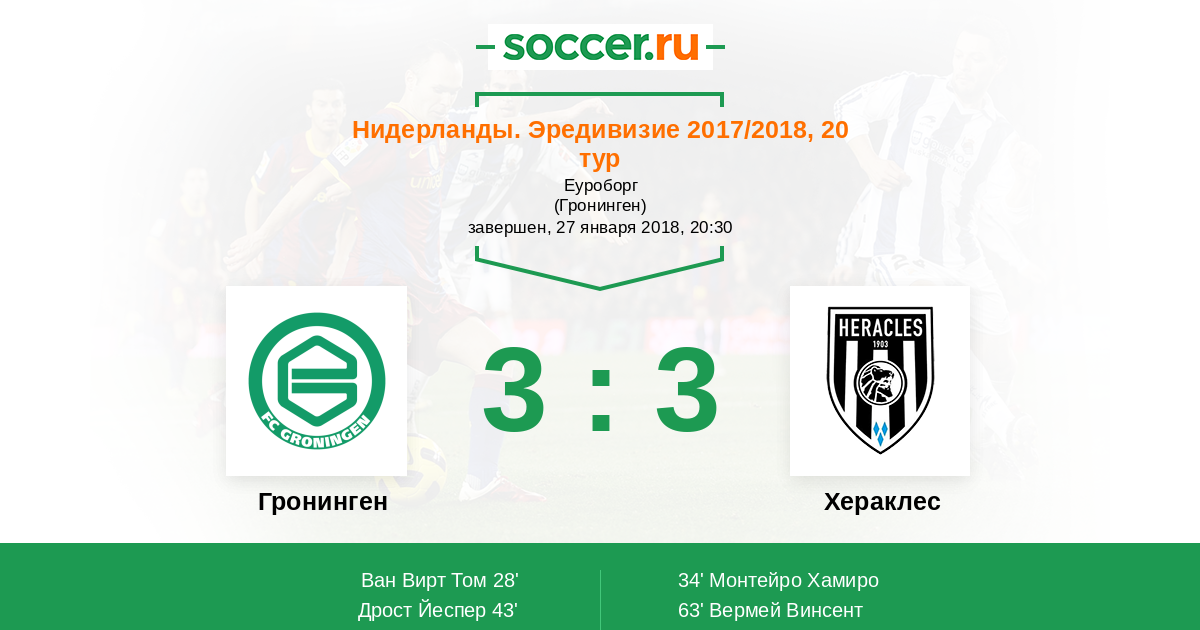 Нидерланды. Эредивизи 04.11.2017 Хераклес Логотип футбольный клуб Хераклес (Алмело) 2:1 Логотип футбольный клуб Гронинген Гронинген