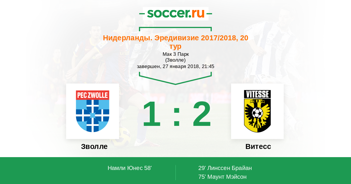 Нидерланды. Эредивизи 05.11.2017 Витесс Логотип футбольный клуб Витесс (Арнем) 0:0 Логотип футбольный клуб Зволле Зволле