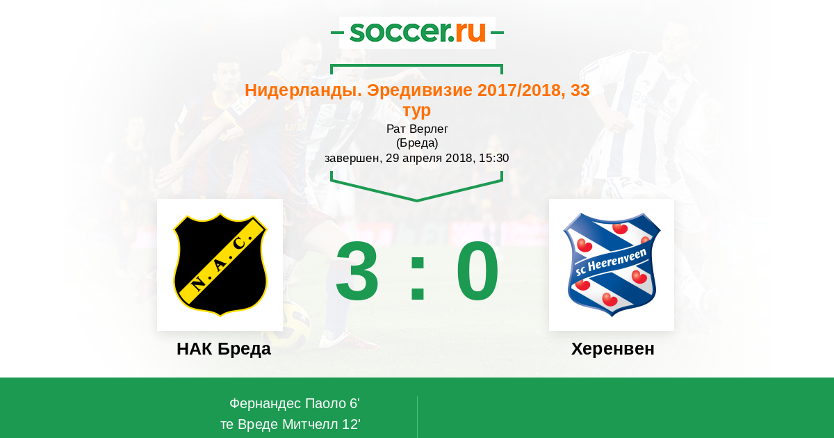 Нидерланды. Эредивизи 16.12.2017 Херенвен Логотип футбольный клуб Херенвен 1:0 Логотип футбольный клуб НАК Бреда НАК Бреда