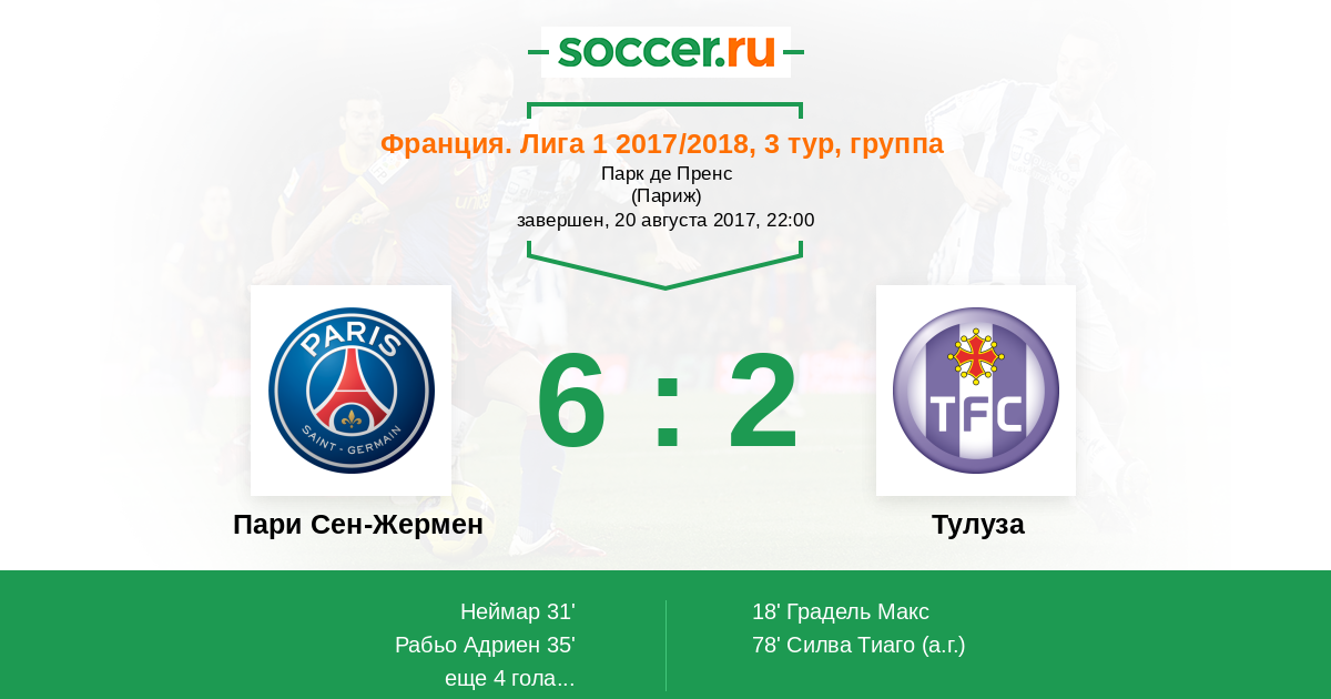 Франция. Лига 1 10.02.2018 Тулуза Логотип футбольный клуб Тулуза 0:1 Логотип футбольный клуб Пари Сен-Жермен (Париж) Пари Сен-Жермен