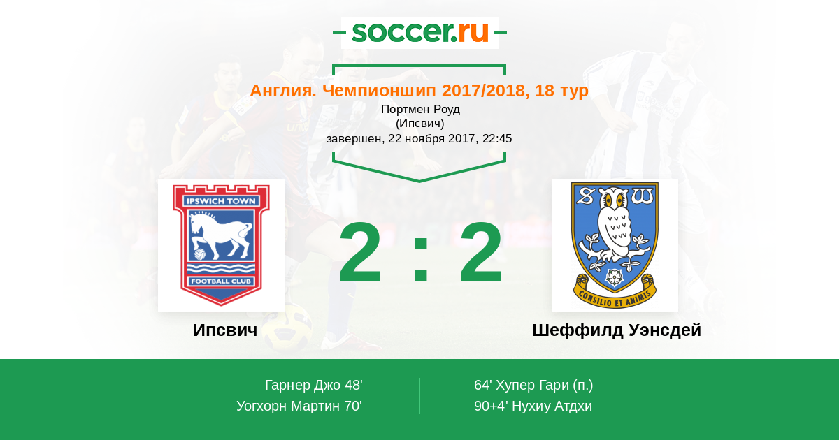 Англия. Чемпионшип 06.03.2018 Шеффилд Уэнсдей Логотип футбольный клуб Шеффилд Уэнсдей 1:2 Логотип футбольный клуб Ипсвич Ипсвич