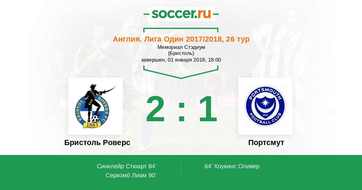 Англия. Первая Футбольная Лига 26.09.2017 Портсмут Логотип футбольный клуб Портсмут 3:0 Логотип футбольный клуб Бристоль Роверс Бристоль Роверс