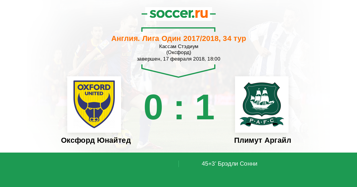 Англия. Первая Футбольная Лига 18.11.2017 Плимут Аргайл Логотип футбольный клуб Плимут Аргайл 0:4 Логотип футбольный клуб Оксфорд Юнайтед Оксфорд Юнайтед