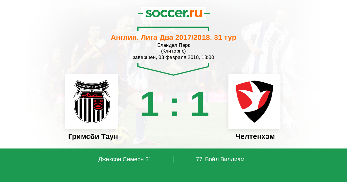 Англия. Вторая Футбольная Лига 17.10.2017 Челтенхэм Логотип футбольный клуб Челтенхэм 2:3 Логотип футбольный клуб Гримсби Таун (Клифорпс) Гримсби Таун