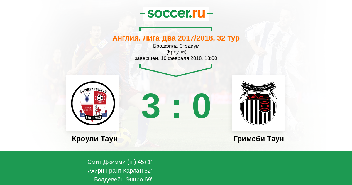 Англия. Вторая Футбольная Лига 09.03.2019 Кроули Таун Логотип футбольный клуб Кроули Таун 2:1 Логотип футбольный клуб Гримсби Таун (Клифорпс) Гримсби Таун