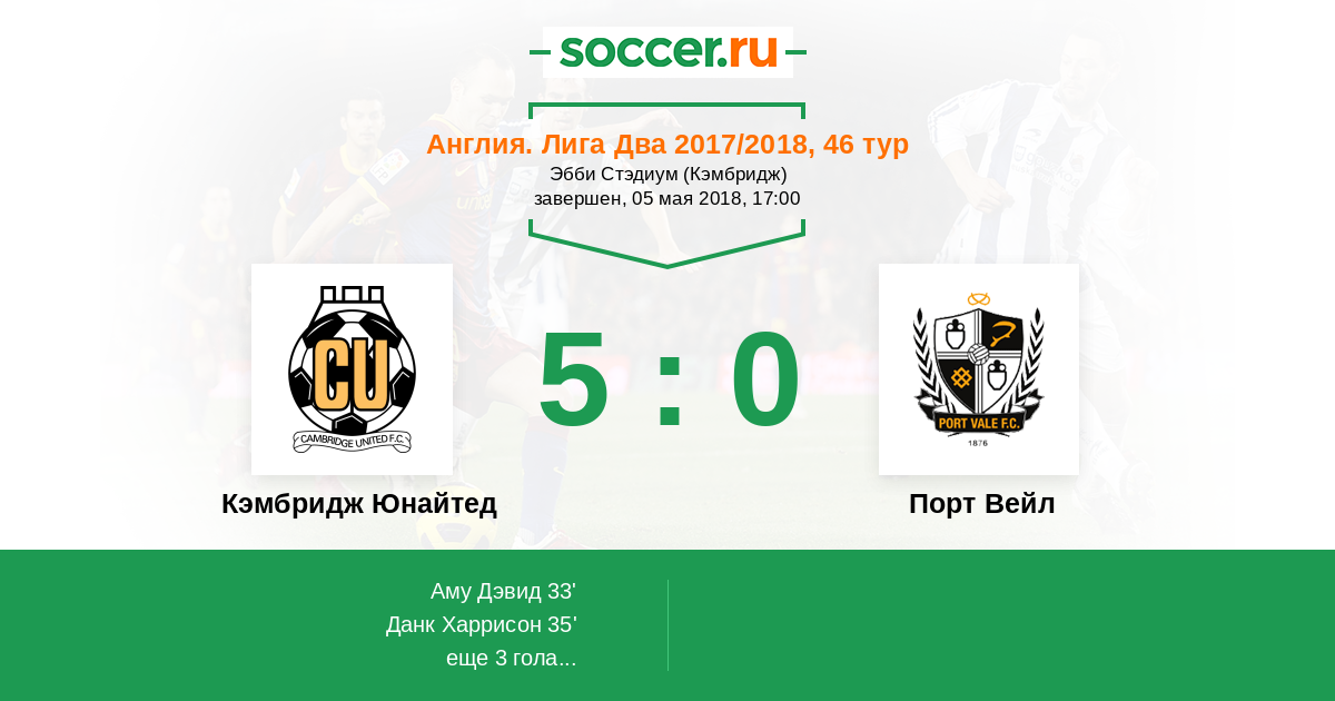 Англия. Вторая Футбольная Лига 04.08.2018 Порт Вейл Логотип футбольный клуб Порт Вейл (Сток-он-Трент) 3:0 Логотип футбольный клуб Кэмбридж Юнайтед Кэмбридж Юнайтед