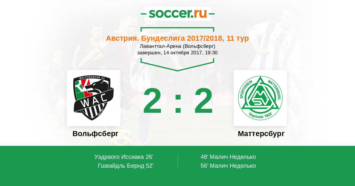 Австрия. Бундеслига 16.12.2017 Маттерсбург Логотип футбольный клуб Маттерсбург 5:1 Логотип футбольный клуб Вольфсберг Вольфсберг