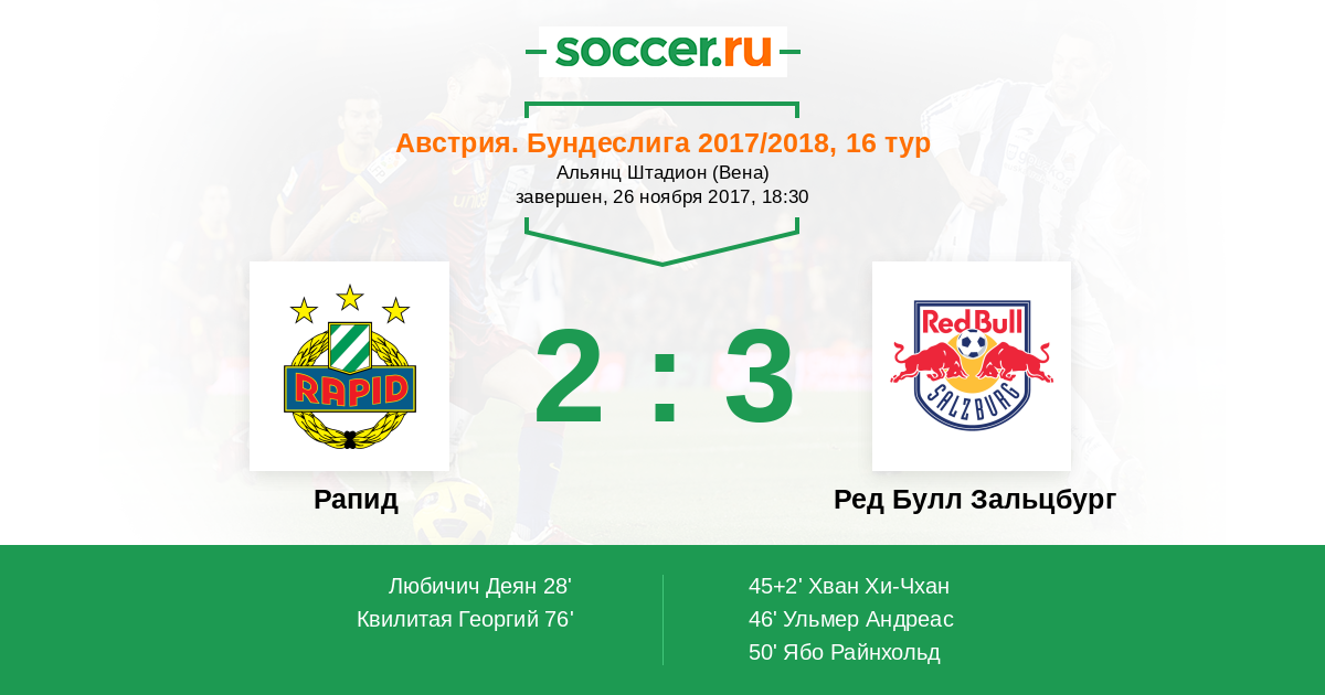 Австрия. Бундеслига 20.11.2016 Ред Булл Зальцбург Логотип футбольный клуб Ред Булл Зальцбург 2:1 Логотип футбольный клуб Рапид (Вена) Рапид