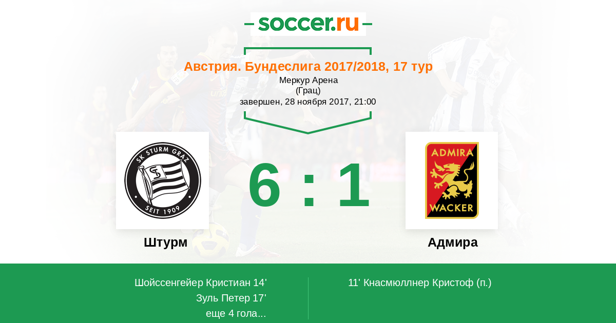 Австрия. Бундеслига 30.11.2016 Штурм Логотип футбольный клуб Штурм (Грац) 0:2 Логотип футбольный клуб Адмира (Мёдлинг) Адмира