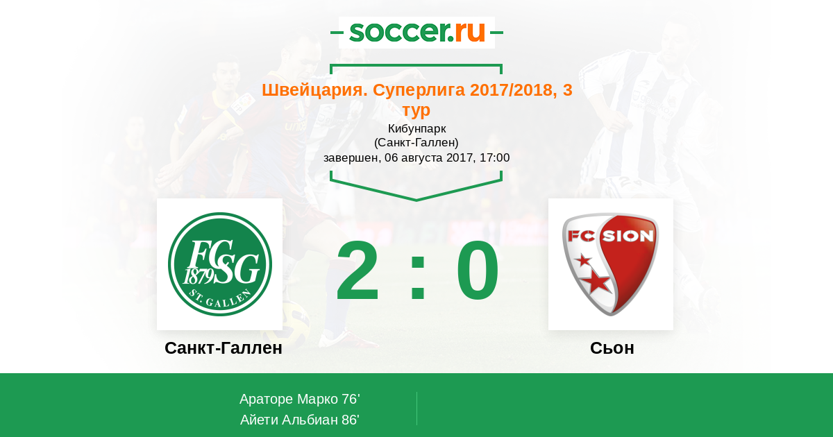 Швейцария. Суперлига 15.10.2017 Сьон Логотип футбольный клуб Сьон 1:2 Логотип футбольный клуб Санкт-Галлен Санкт-Галлен