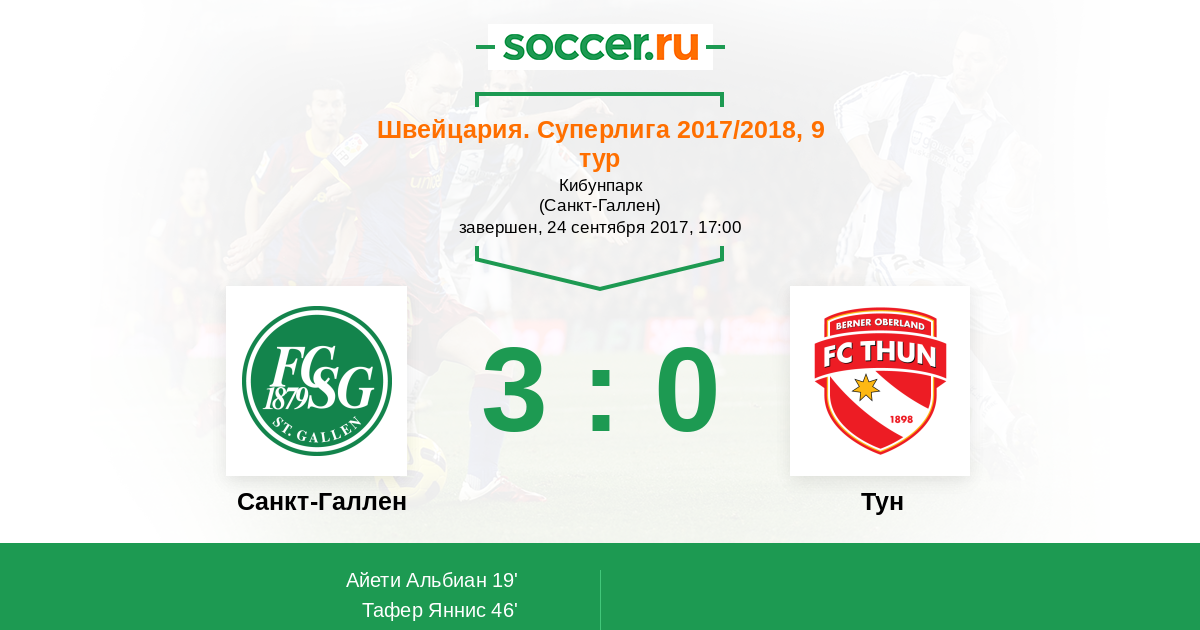 Швейцария. Суперлига 20.09.2016 Тун Логотип футбольный клуб Тун 1:2 Логотип футбольный клуб Санкт-Галлен Санкт-Галлен