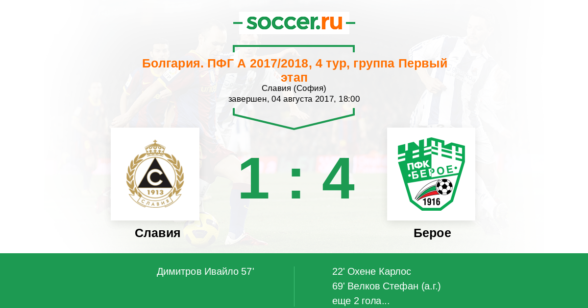 Болгария. Первая лига 01.09.2012 Славия Логотип футбольный клуб Славия (София) 6:1 Логотип футбольный клуб Берое (Стара-Загора) Берое