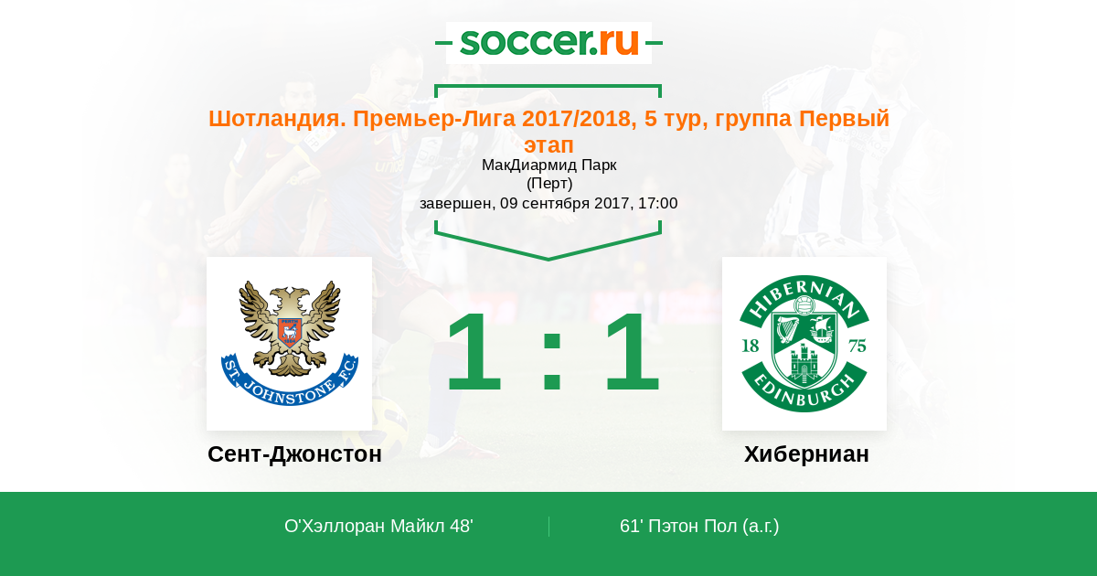 Шотландия. Премьер-Лига 16.03.2018 Сент-Джонстон Логотип футбольный клуб Сент-Джонстон (Перт) 1:1 Логотип футбольный клуб Хиберниан (Эдинбург) Хиберниан