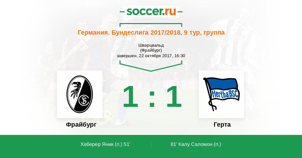 Германия. Бундеслига 21.10.2018 Герта Логотип футбольный клуб Герта (Берлин) 1:1 Логотип футбольный клуб Фрайбург Фрайбург