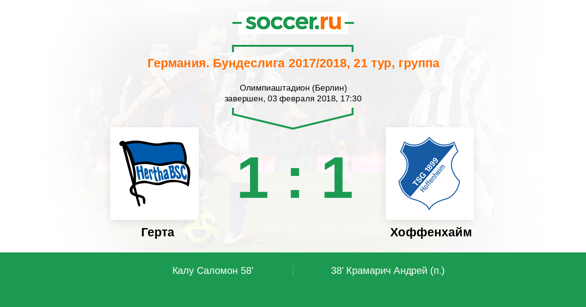 Германия. Бундеслига 31.03.2017 Герта Логотип футбольный клуб Герта (Берлин) 1:3 Логотип футбольный клуб Хоффенхайм (Зинсхайм) Хоффенхайм