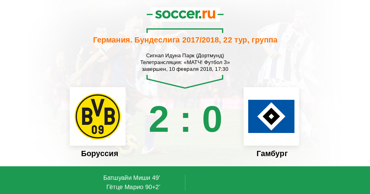 Германия. Бундеслига 20.09.2017 Гамбург Логотип футбольный клуб Гамбург 0:3 Логотип футбольный клуб Боруссия (Дортмунд) Боруссия