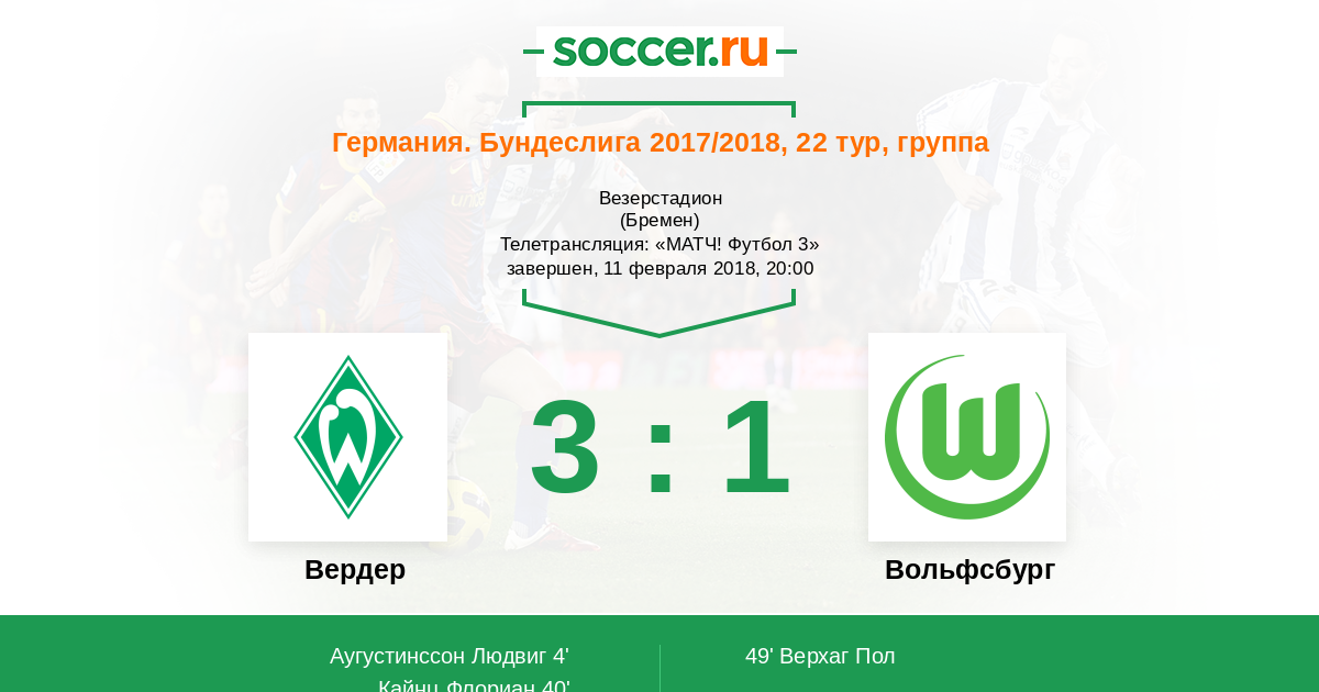 Германия. Бундеслига 24.02.2017 Вольфсбург Логотип футбольный клуб Вольфсбург 1:2 Логотип футбольный клуб Вердер (Бремен) Вердер