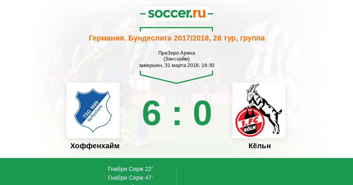 Германия. Бундеслига 05.11.2017 Кёльн Логотип футбольный клуб Кёльн 0:3 Логотип футбольный клуб Хоффенхайм (Зинсхайм) Хоффенхайм