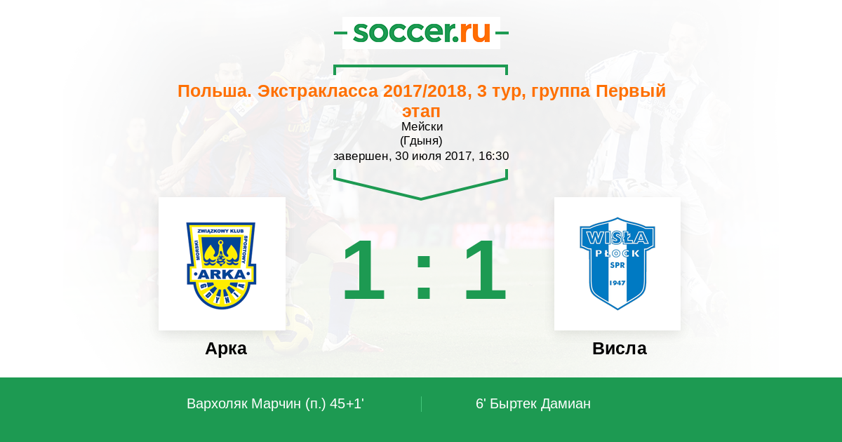 Польша. Экстракласса 22.04.2017 Арка Логотип футбольный клуб Арка (Гдыня) 1:1 Логотип футбольный клуб Висла (Плоцк) Висла