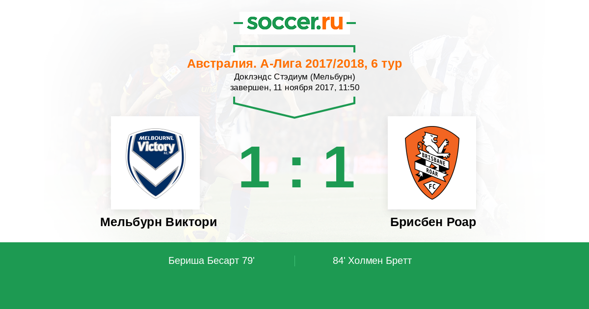Австралия. А-Лига 07.10.2016 Брисбен Роар Логотип футбольный клуб Брисбен Роар 1:1 Логотип футбольный клуб Мельбурн Виктори Мельбурн Виктори