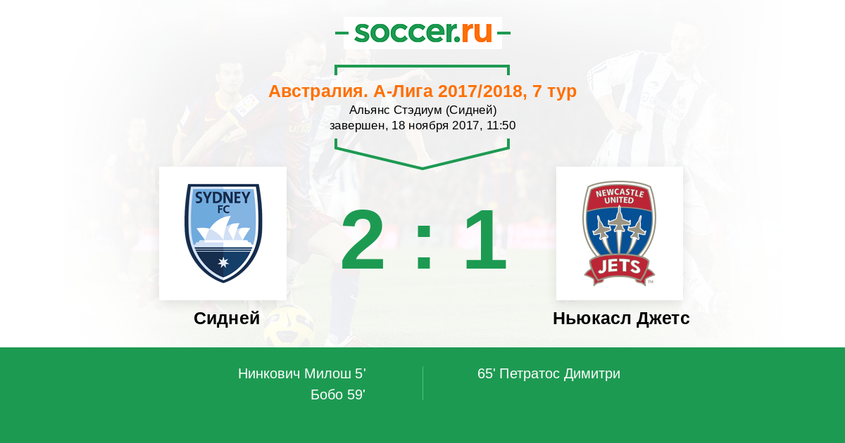 Австралия. А-Лига 03.01.2018 Сидней Логотип футбольный клуб Сидней 2:2 Логотип футбольный клуб Ньюкасл Джетс Ньюкасл Джетс