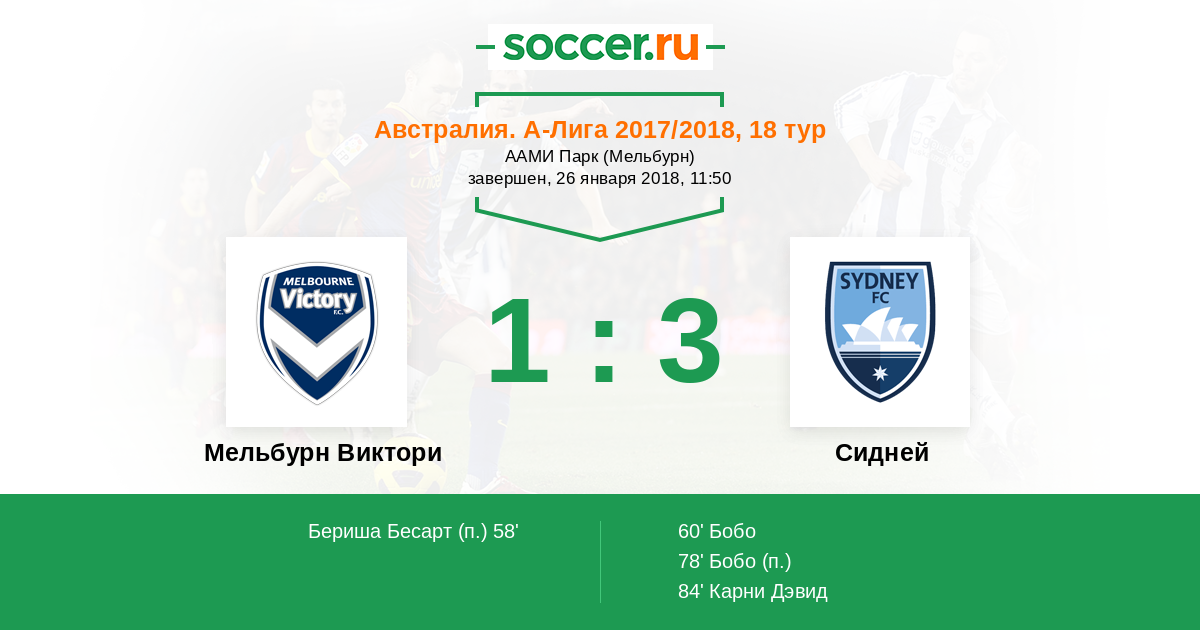 Австралия. А-Лига 28.04.2018 Сидней Логотип футбольный клуб Сидней 2:3 Логотип футбольный клуб Мельбурн Виктори Мельбурн Виктори