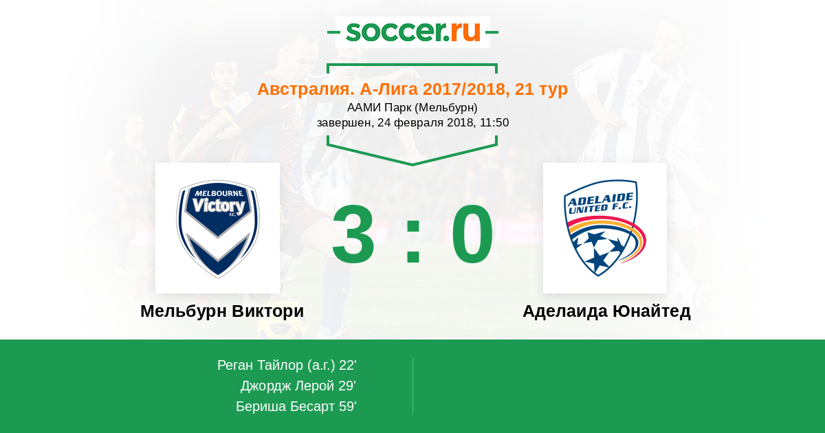 Австралия. А-Лига 25.02.2017 Мельбурн Виктори Логотип футбольный клуб Мельбурн Виктори 2:1 Логотип футбольный клуб Аделаида Юнайтед Аделаида Юнайтед