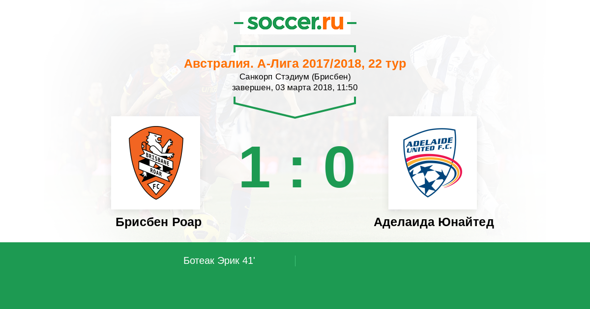 Австралия. А-Лига 13.10.2017 Брисбен Роар Логотип футбольный клуб Брисбен Роар 1:2 Логотип футбольный клуб Аделаида Юнайтед Аделаида Юнайтед