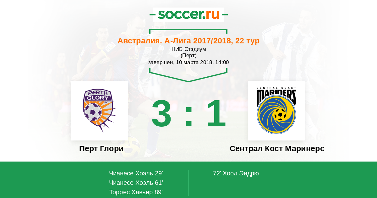 Австралия. А-Лига 22.10.2017 Перт Глори Логотип футбольный клуб Перт Глори 2:1 Логотип футбольный клуб Сентрал Кост Маринерс Сентрал Кост Маринерс