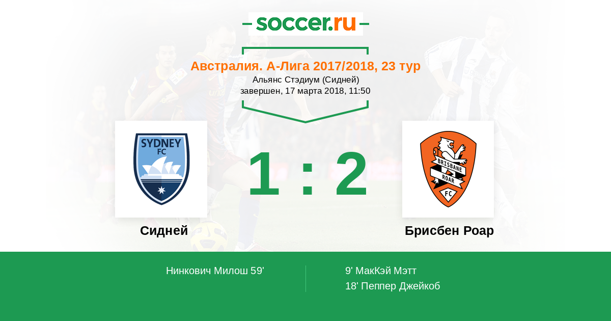 Австралия. А-Лига 25.11.2017 Сидней Логотип футбольный клуб Сидней 3:1 Логотип футбольный клуб Брисбен Роар Брисбен Роар