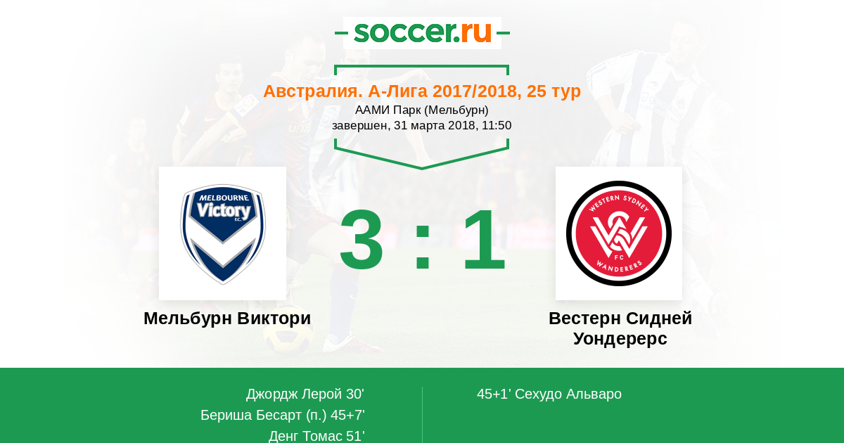 Австралия. А-Лига 25.03.2016 Мельбурн Виктори Логотип футбольный клуб Мельбурн Виктори 2:0 Логотип футбольный клуб Вестерн Сидней Уондерерс Вестерн Сидней Уондерерс