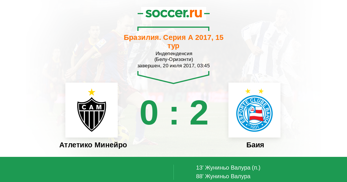 Бразилия. Серия А 15.08.2013 Атлетико Минейро Логотип футбольный клуб Атлетико Минейро (Белу-Оризонти) 2:0 Логотип футбольный клуб Баия (Салвадор) Баия