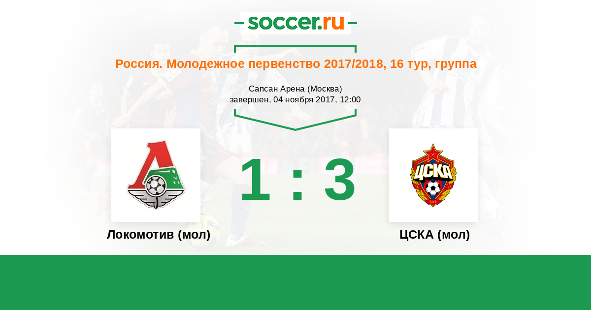 Россия. Премьер-Лига U21 22.10.2016 Локомотив (мол) Логотип футбольный клуб Локомотив (мол) (Москва) 1:2 Логотип футбольный клуб ЦСКА (мол) (Москва) ЦСКА (мол)
