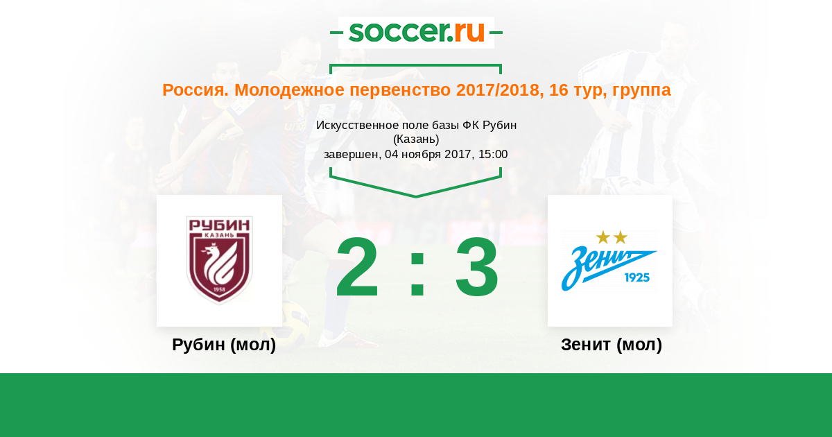 Россия. Премьер-Лига U21 01.04.2017 Рубин (мол) Логотип футбольный клуб Рубин (мол) (Казань) 2:2 Логотип футбольный клуб Зенит (мол) (Санкт-Петербург) Зенит (мол)