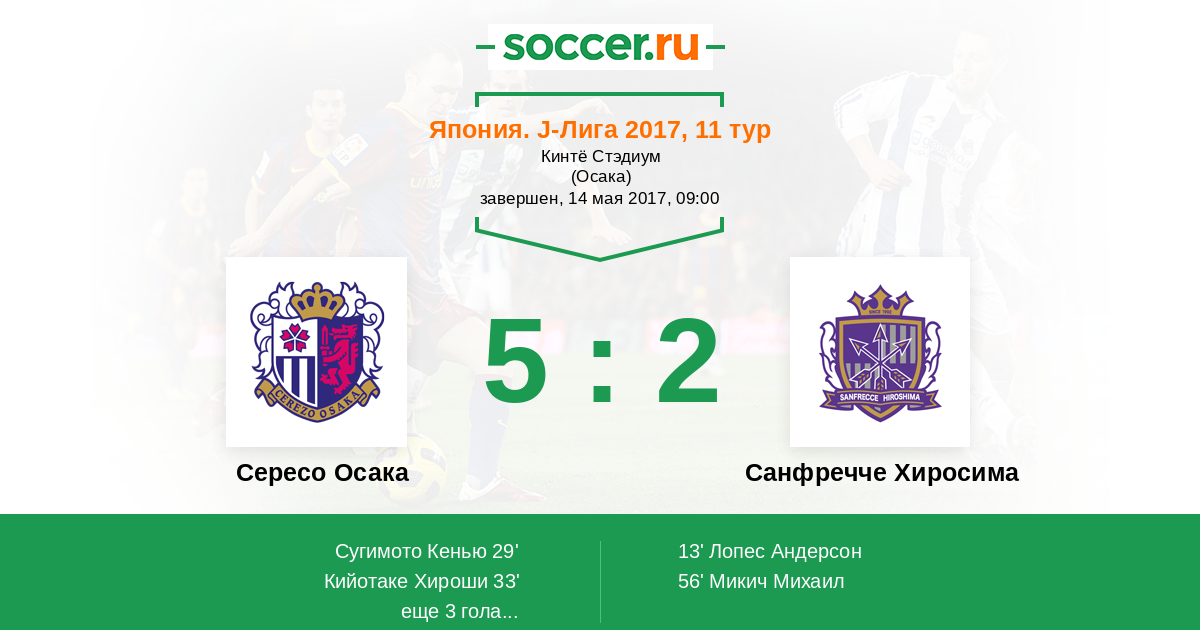 Япония. J-Лига 1 16.09.2017 Санфречче Хиросима Логотип футбольный клуб Санфречче Хиросима 1:0 Логотип футбольный клуб Сересо Осака Сересо Осака